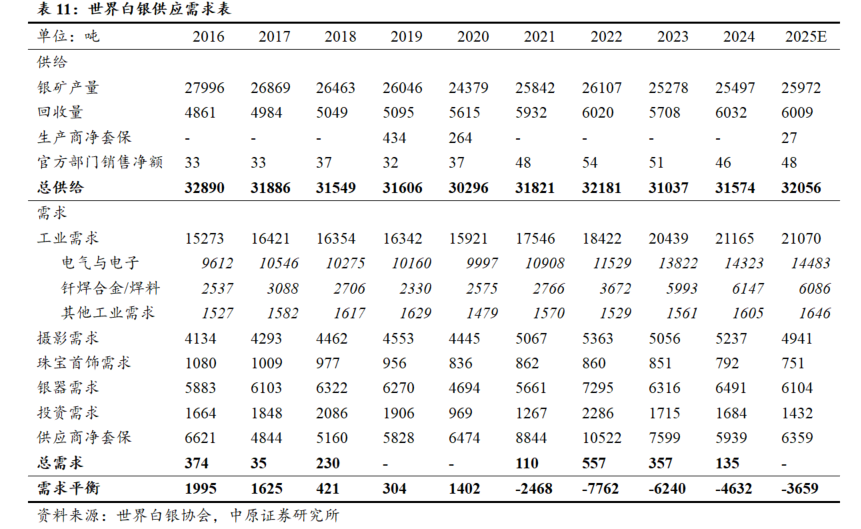 2021年以来白银处于供不应求状态。根据世界白银协会数据,2016-2020年白银整体处于供过于求状态,但2021年全球白银供需平衡由正转负,缺口达到2468吨。此后一直存在缺口,2024年白银供需缺口达到4632吨,预计2025年缺口将维持在3659吨的高位。考虑到白银供给缺乏弹性,同时需求侧受光伏用银需求和银价上涨后实物投资需求拉动,白银未来供需缺口或将持续。