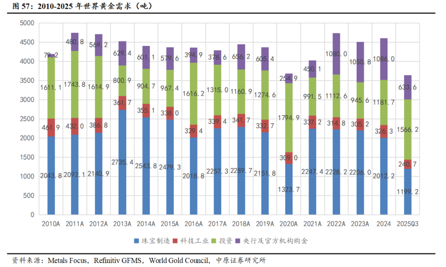 全球黄金总需求量同比增加,投资类黄金需求占主导地位。2025年前三季度,2025年前三季度,全球黄金需求总量同比增长1%,达到3717吨;以价值计,需求总额同比大幅增长41%至3840亿美元,反映出金价持续走强背景下的“量稳价升”格局。从细分领域来看,投资类需求占据主导地位。三季度,全球黄金ETF总持仓大幅增加222吨,同时金条与金币需求连续第四个季度保持在300吨以上(本季度为316吨),两者共同推动投资需求占比提升。此外,全球央行购金规模仍处于高位,三季度净购入220吨,环比增长28%,但较去年同期的724吨有所放缓;在金价高企的背景下,金饰消费呈现“量减价增”的结构性特征:三季度消费量同比下降19%至371吨,为连续第六个季度下滑;然而消费金额却逆势增长13%,达到410亿美元;科技用金需求方面,尽管人工智能等新兴领域对电子用金有所拉动,但在全球关税政策调整与金价上涨的双重制约下,整体需求较2024年同期略有回落。