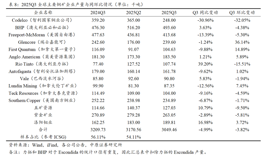 2025Q3全球铜矿供给同环比双降,海外矿企产量明显下降,国内矿企贡献增量。根据15家主要矿企披露的2025年第三季度生产数据,样本企业当季合计铜产量为304.95万吨,同比下降4.99%,环比下降3.82%。从地域分布来看:海外铜矿企产量同比下降7.23%至246.96万吨,其中,智利国家铜业(Codelco)受旗下El Teniente矿7月发生崩塌事故影响,产量显著下滑;自由港麦克莫兰(Freeport-McMoRan)则因其印尼Grasberg铜矿9月遭遇严重泥石流灾害并暂停运营,导致产量同比大幅减少。这两大主力矿山的突发事故,是海外供应下降的核心原因。国内矿企产量达到57.99万吨,同比增长5.86%,主要由洛阳钼业和五矿资源贡献增量。