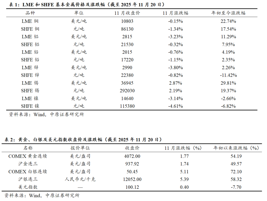 2025年基本金属价格多数上行,黄金价格延续上行态势。2025年1-3月,全球制造业景气度边际改善,标普全球制造业PMI连续3个月运行于50荣枯线以上,同时国内“以旧换新”和国家补贴政策刺激家电、汽车消费,为基本金属需求奠定基础,受宏观经济回暖的影响,基本金属价格普遍上涨。4-5月受地缘政治冲突、对等关税、主要经济体PMI回落至收缩区间等因素影响,全球贸易政策不确定性增加,基本金属价格普遍下降。9-11月在美联储降息和供给扰动下,基本金属价格呈现“铜铝领涨、锌铅承压、锡坚挺、镍偏弱”;黄金价格受到美联储降息、美元信用问题、各国央行持续购金、地缘政治冲突等因素影响,创历史最高价后回落并维持高位震荡。截至11月20日,基本金属价格年内多数上涨,LME锡价格上涨29.81%,LME铜价格上涨22.74%, LME铝价格上涨11.29%,LME铅价格上涨4.19%,LME锌上涨2.26%,LME镍价格下跌2.66%;贵金属价格普遍收涨,COMEX黄金价格年初以来涨幅达54.19%,COMEX白银价格涨幅达72.10%。