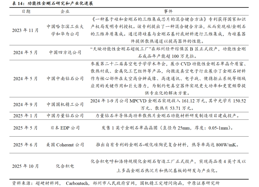 产业化大幕正在徐徐拉开,国内外企业不断取得技术突破并尝试工业化生产。2023年11月20日,哈工大和华为联合申请的《一种基于硅和金刚石的三维集成芯片的混合键合方法》专利获得国家知识产权局发明专利授权。2024年5月18日,四方达年产70万克拉“天璇功能性金刚石超级工厂”在郑州经开综保区B区正式投产。2025年10月,化合积电呼和浩特规模化金刚石智造工厂正式投产,可实现实现高品质4英寸及以上多晶金刚石热沉片和热沉基板的研发与产业化。2025年11月,四方达在交易所互动平台表示公司已具备批量制备大尺寸(12英寸)金刚石衬底及薄膜的相关生产能力。国机精工在调研纪要中表示其金刚石功能化应用以金刚石散热片和光学窗口片为主,今年销售收入有望超过1000万元。这些产业化进展表明,功能性金刚石逐步从实验室走向市场,未来空间广阔。