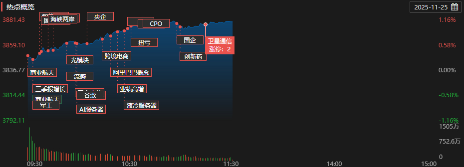 盘面上,CPO板块持续走强,光库科技(300620)、德科立、长光华芯20CM涨停封板,永鼎股份(600105)、可川科技(603052)等数只个股涨停封板。PCB概念早盘活跃,沪电股份(002463)、泰永长征(002927)、棒杰股份(002634)等涨停封板。胜宏科技(300476)涨超5%。商业航天持续走强,佳缘科技(301117)、航天环宇20CM涨停封板,航天动力(600343)、上海港湾(605598)等涨停封板。中船系板块调整,中船应急、中船汉光(300847)跌近3%。