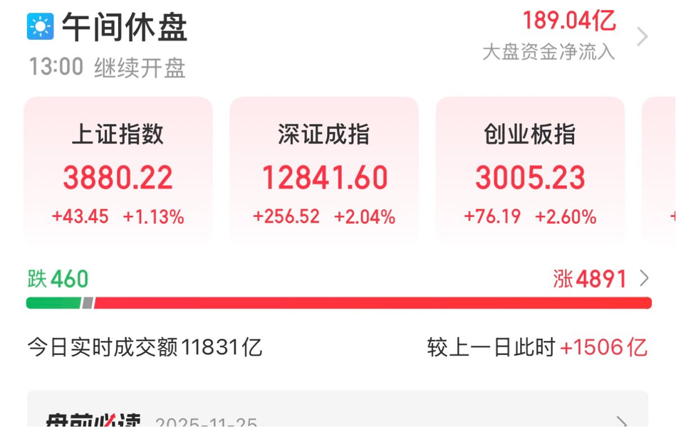 A股三大指数集体上涨,截至午盘,沪指涨1.13%,深成指涨2.04%,创业板指涨2.60%,北证50指数涨1.65%,沪深京三市半日成交额11831亿元,较上日放量1506亿元。全市场超4800只个股上涨。