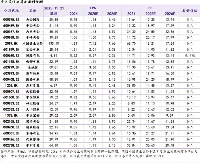 黄金行业推荐中金黄金,山东黄金,赤峰黄金,山金国际,中国黄金国际。铜行业推荐紫金矿业,洛阳钼业,金诚信,西部矿业,藏格矿业,五矿资源。铝行业推荐神火股份,云铝股份,天山铝业,中国宏桥。锑行业推荐湖南黄金,华锡有色。锡行业推荐锡业股份,华锡有色,兴业银锡。