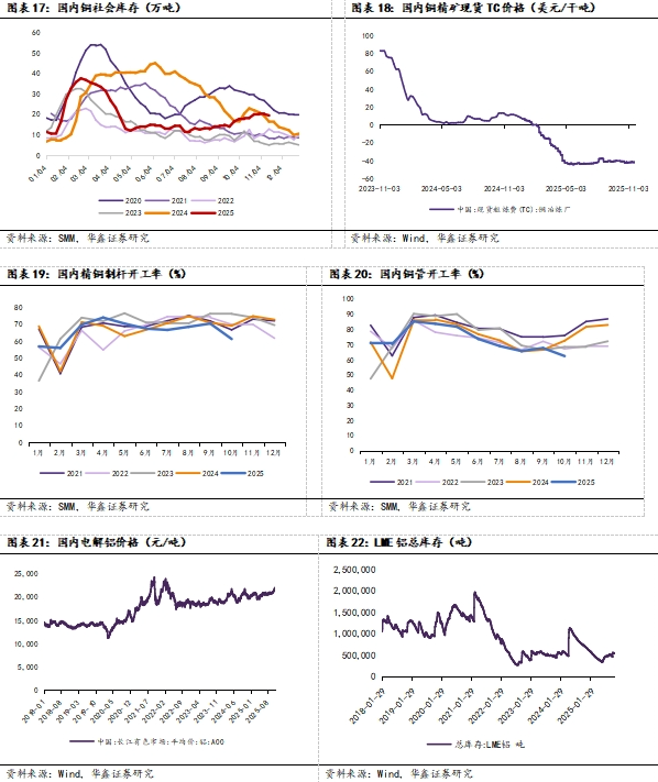 铝:价格方面,国内电解铝价格为21360 元/吨,环比 11 月 14 日-530吨。库存方面,本周 LME 铝库存为548000吨(环比11月14日-4375吨,同比-163050吨);国内上期所库存为123716吨(环比11月14日+ 8817吨,同比-108138吨)。2025年11月20日,SMM统计国内电解铝锭社会库存62.1万吨,环比11月13日+0万吨,同比+5.8万吨。
