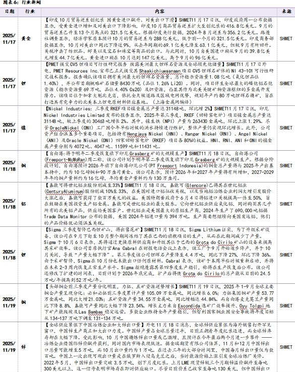 铜:价格方面,本周LME铜收盘价10700美元/吨,环比11月14日-150/吨,跌幅为-1.38%。SHFE铜收盘价85650元/吨,环比11月14日-1170元/吨,跌幅为-1.35%。库存方面,LME库存为155025吨(环比11月14日+19300吨,同比-117600吨);COMEX库存为402876吨(环比11月14日+21580吨,同比+314266吨);SHFE库存为110603吨(环比11月14日+1196吨)。2025年11月20日,SMM统计国内电解铜社会库存19.45万吨,环比11月13日-0.66万吨,同比+3.02万吨。