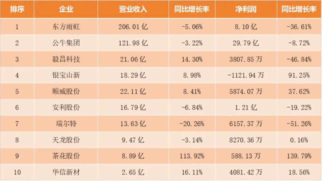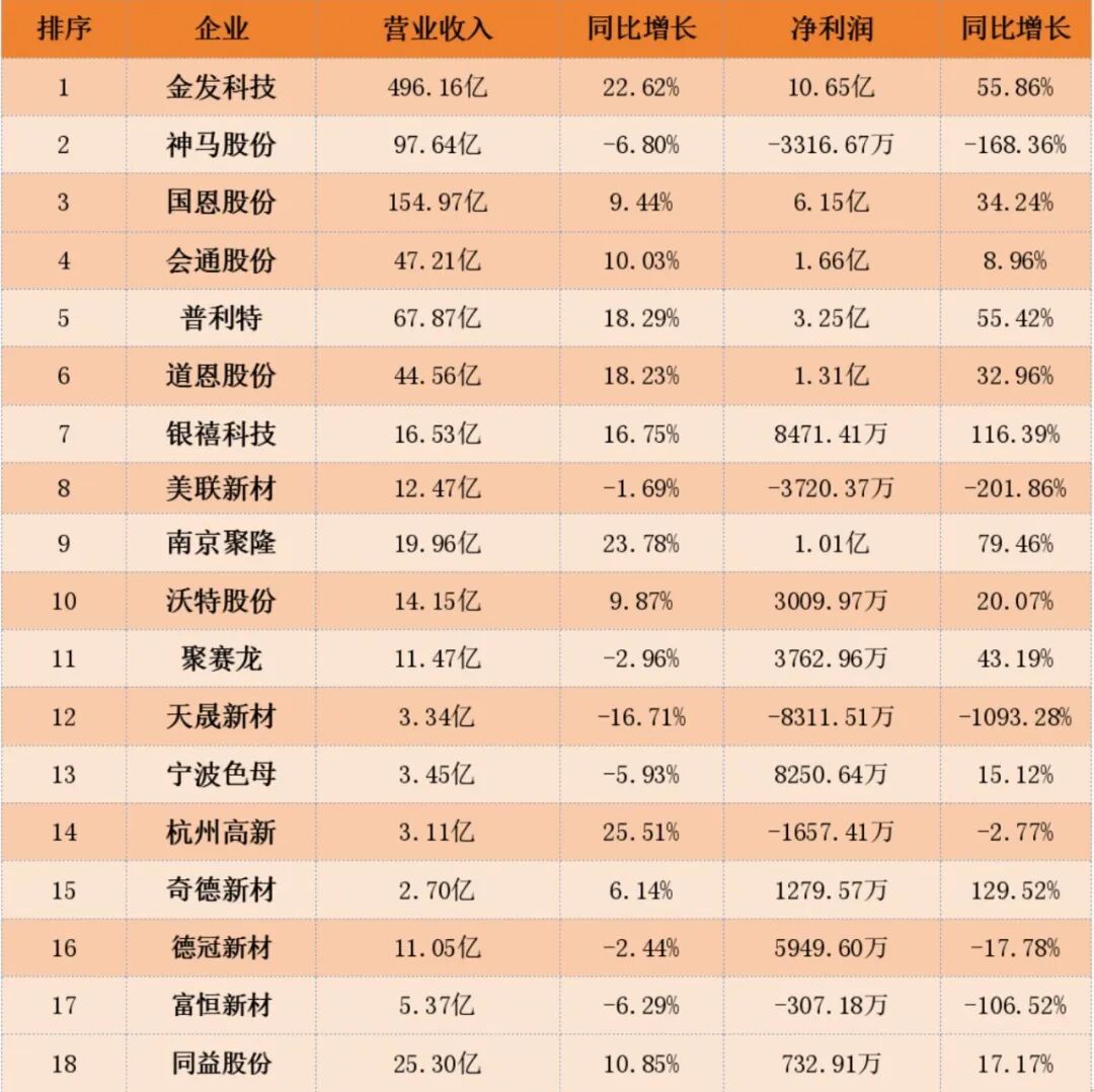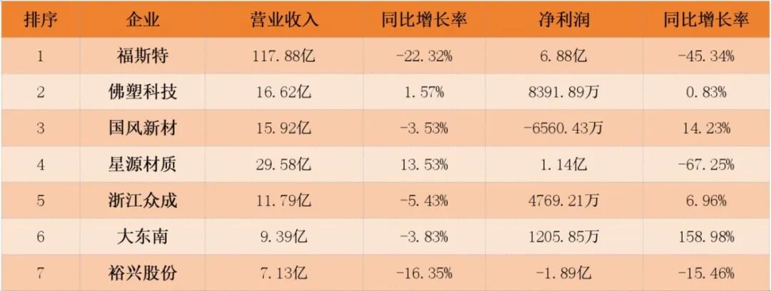 7家功能性塑料薄膜类上市企业2025前三季度营收同比增长的2家。净利润均同比增长的有4家,佛塑科技、国风新材、浙江众成、大东南。