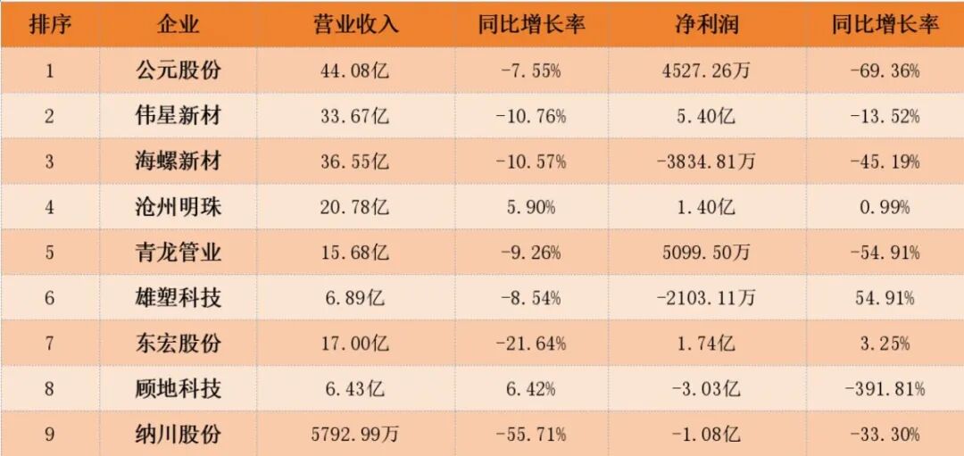 9家塑料管材/型材的上市企业2025前三季度营收同比增长的2家,净利润同比增长的3家。沧州明珠、雄塑科技、东宏股份净利润同比增长。