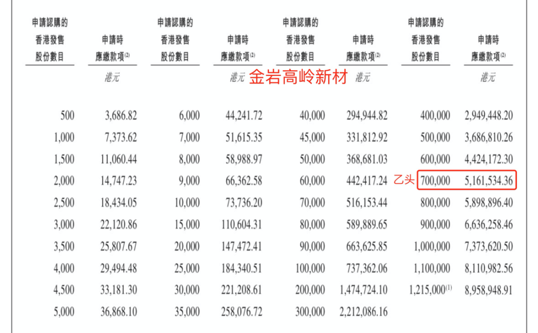 金岩高岭新材招股首日孖展65倍,最终大概率会超购6000倍,甲乙组各2430手。按照20万人申购算,预估一手中签率低于1%,甲组全部抽签。