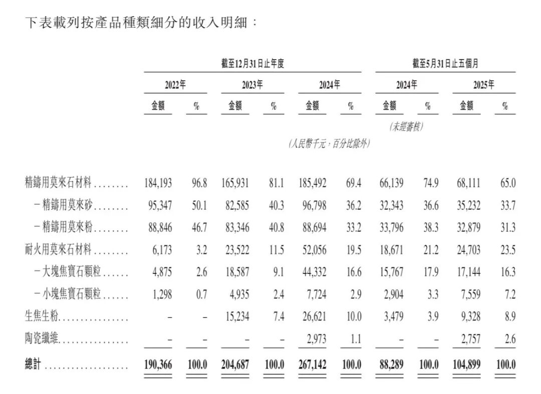 精铸用莫来石材料是公司的核心产品,主要应用于精密铸造工艺中的型壳制作。这些型壳是生产汽车涡轮增压器、航空发动机叶片、医疗设备零件等高端铸件的关键材料。该产品2025年前5个月贡献了公司65%的营业收入。