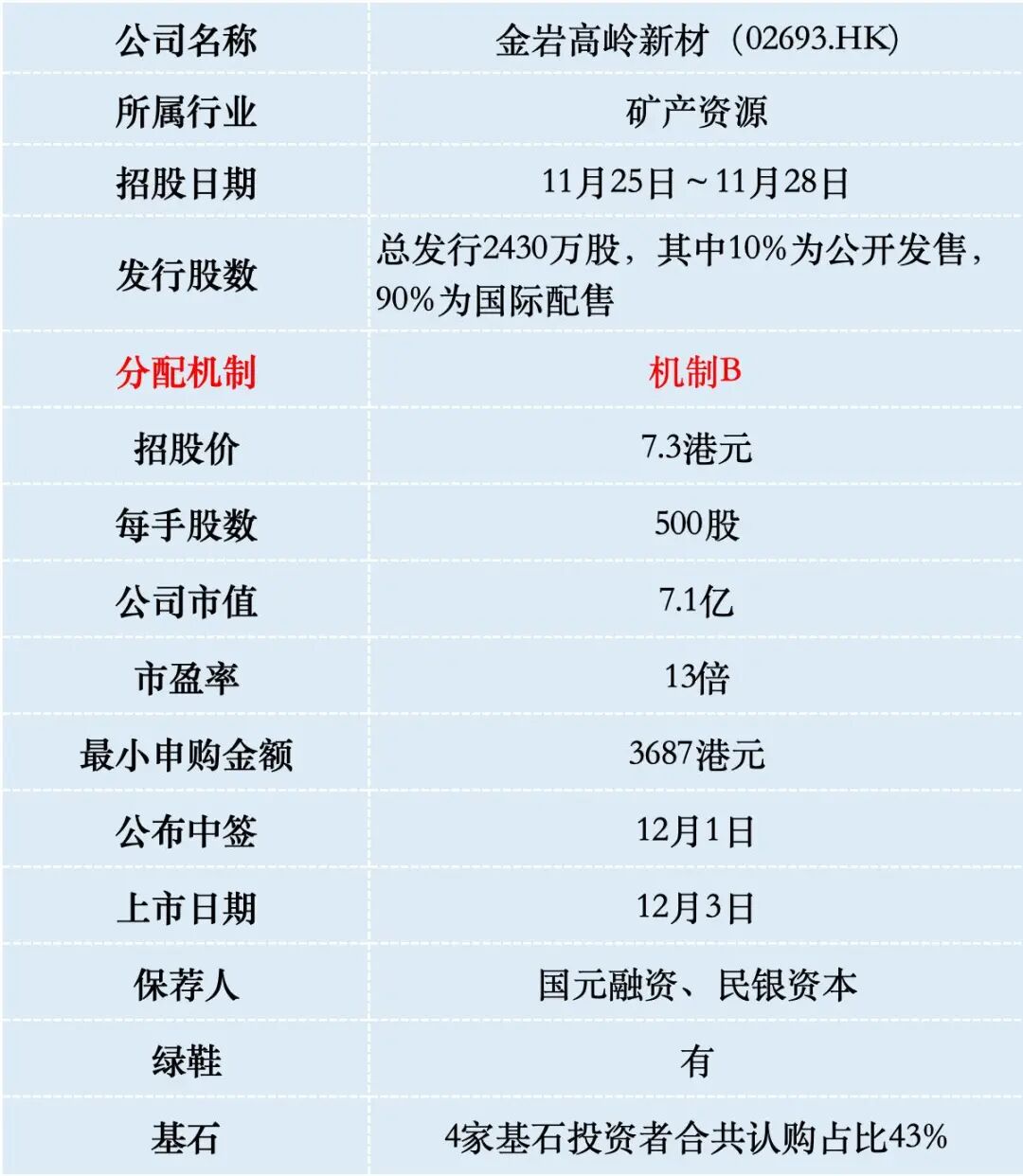 金岩高岭新材本次IPO发行股份占全部股份比例的25%,按招股价7.3港元算,募资1.77亿,4家基石投资者锁定7600万,剩余流通盘约1亿,这个流通盘很小。