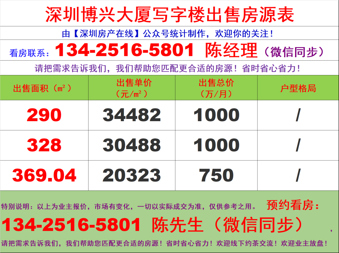 深圳博兴大厦写字楼办公室出售房源价格表