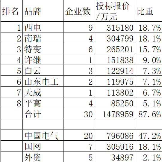 西电、南瑞、特变、许继、白云、山东电工、天威、平高8个领先品牌的30家企业合计中1478959万元,占总金额的87.6%,品牌集中度高。