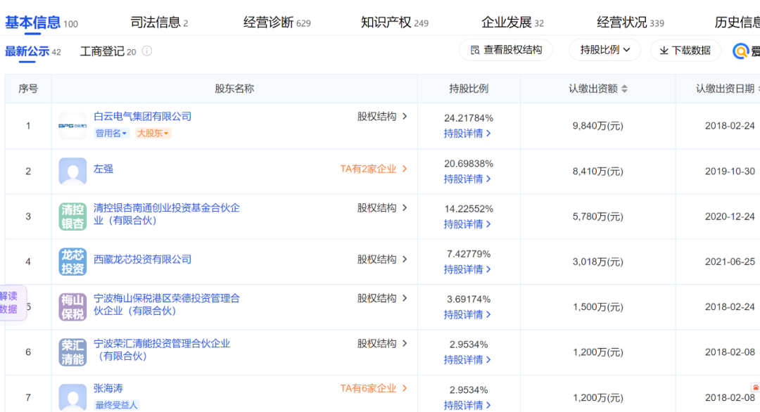 白云电气集团有限公司持股24.21784%,为荣信汇科电气股份有限公司第一大股东。左强持股20.69838%,清控银杏南通创业投资基金合伙企业(有限合伙)持股14.22552%,西藏龙芯投资有限公司持股7.42779%,宁波梅山保税港区荣德投资管理合伙企业(有限合伙)持股3.69174%,宁波荣汇清能投资管理合伙企业(有限合伙)持股2.9534%,张海涛持股2.9534%。