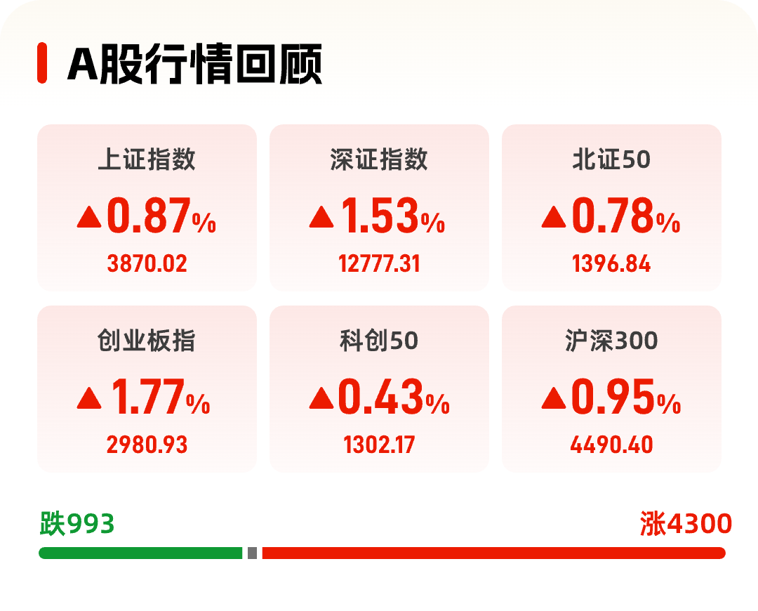 11月25日,市场震荡拉升,创业板指涨近2%,此前一度涨超3%。 截至收盘,沪指涨0.87%,深成指涨1.53%,创业板指涨1.77%。