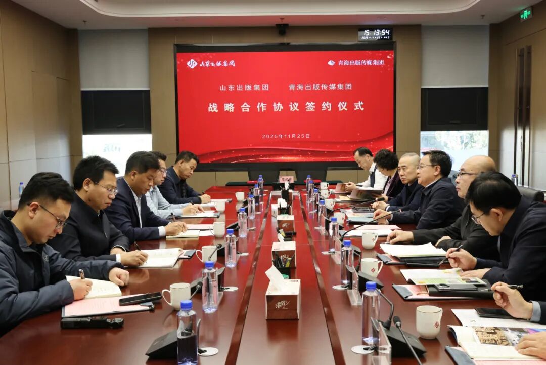 11月25日,集团党委书记、董事长刘文强与青海出版传媒集团党委书记、董事长王永昌在集团举行工作会谈,签署战略合作协议,集团党委副书记、董事、总经理郭海涛主持会议。