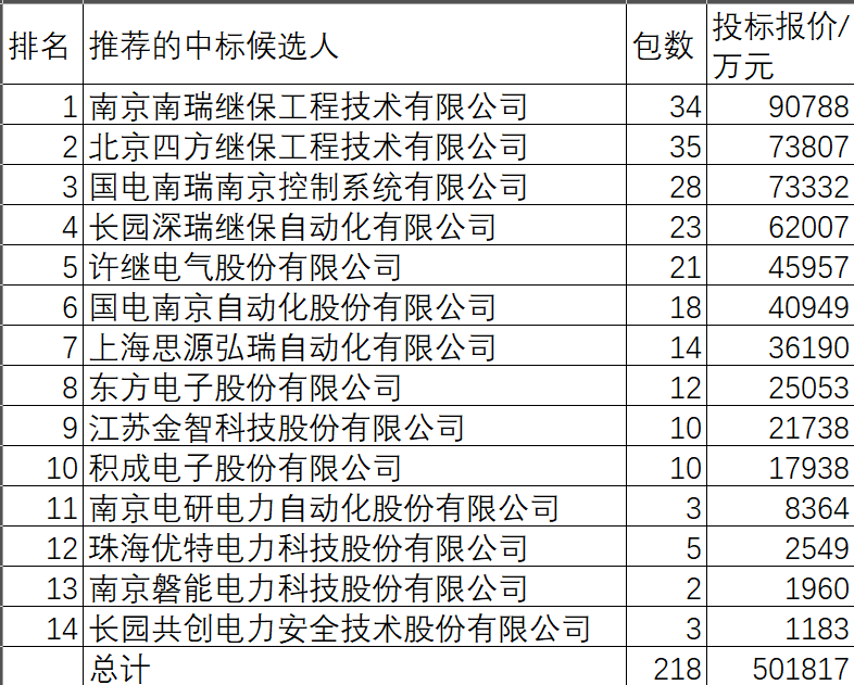 国网2025前5继电保护共招218包501817万元,由14家供应商中标提供。