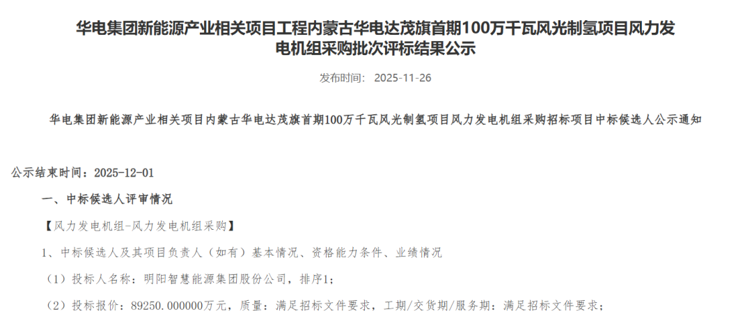 11月26日,中国华电集团电子商务平台发布《华电集团新能源产业相关项目内蒙古华电达茂旗首期100万千瓦风光制氢项目风力发电机组采购招标项目中标候选人公示》的公告。