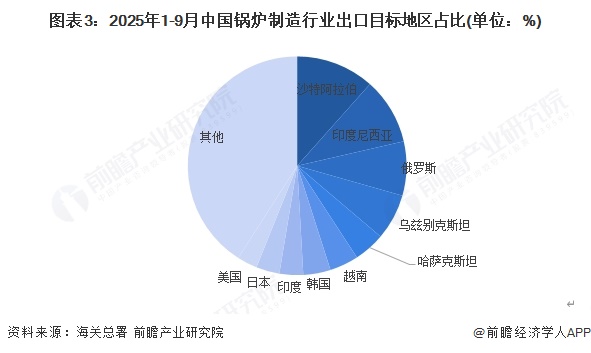 从锅炉出口目标地区来看,2025年1-9月,中国锅炉出口目的地以沙特阿拉伯为主,其次为印度尼西亚,二者占比总和超过20%,其次分别为俄罗斯、乌兹别克斯坦、哈萨克斯坦、越南等地。