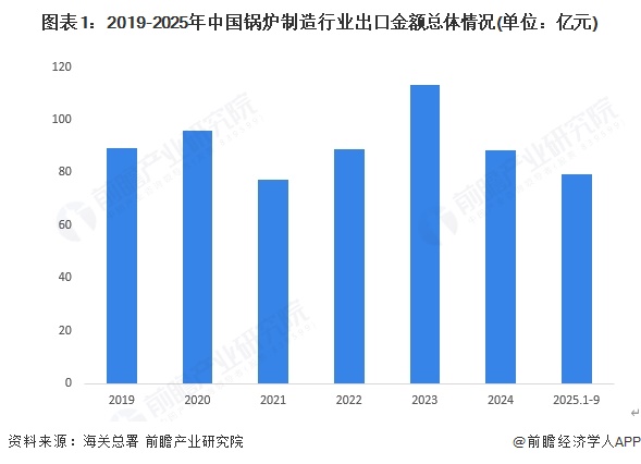 根据中国海关总署的数据,我国锅炉相关产品出口金额波动变化,2024年我国锅炉行业出口总金额为88亿元,同比下跌22.16%。2025年1-9月出口额超过79亿元。整体来看,我国锅炉相关产品出口保持稳定。