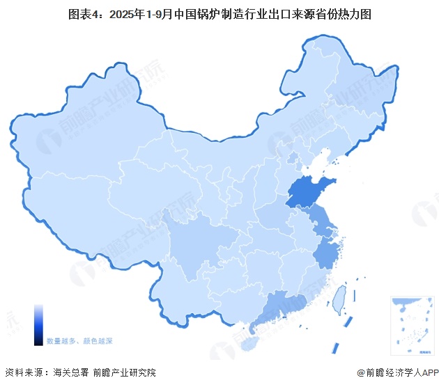 从锅炉制造行业出口来源省份来看,2025年1-9月,山东省出口金额较高,达到21.32亿元。江苏、浙江、广东、四川等地出口较为突出。总体来看,我国锅炉出口主要来源于沿海省份。