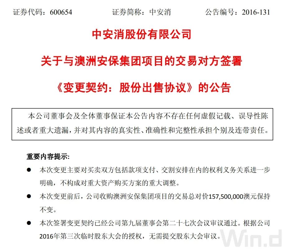公告显示,中安科于2016年完成对澳洲安保集团100%股权的收购,交易对价为1.575亿澳元(约合人民币7.45亿元)。彼时澳洲安保集团100%股权的预估值为1.53亿澳元。