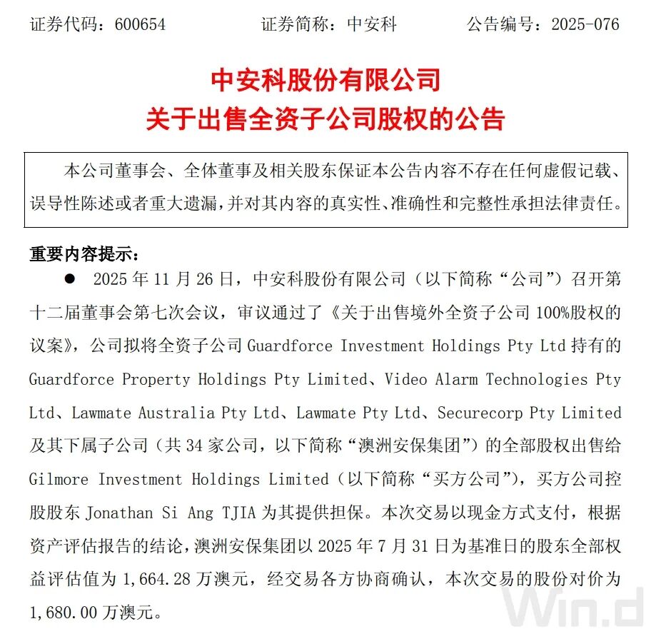 项乾消息:11月26日,中安科(600654.SH)宣布将其全资子公司Guardforce Investment Holdings Pty Ltd持有的澳洲安保集团100%股权出售给Gilmore Investment Holdings Limited,交易金额为1,680.00万澳元,约7768万元人民币。
