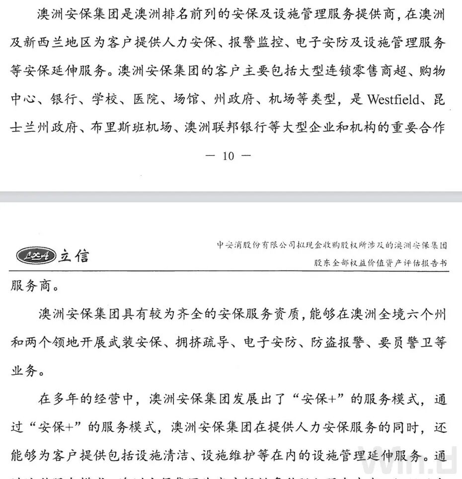 公告显示,澳洲安保集团的股东全部权益评估值为1664.28万澳元,折合人民币为7695.29万元。较1664.28万澳元的评估值溢价0.94%。