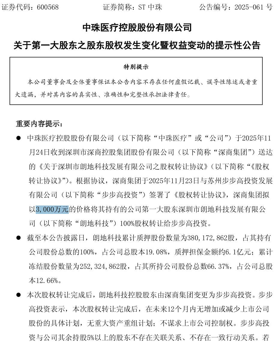 11月24日晚,ST中珠发布公告称,深商集团于前一日与苏州步步高投资发展有限公司(简称“步步高投资”)签署了《股权转让协议》,深商集团拟以3000万元的价格将其持有的深圳市朗地科技发展有限公司(简称“朗地科技”)100%股权转让给步步高投资。