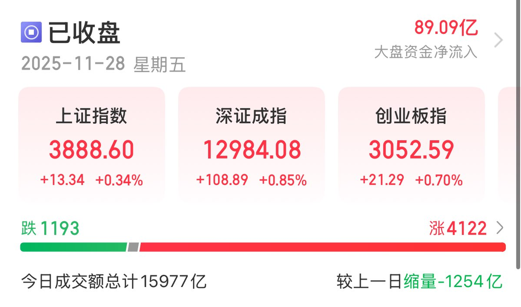 截至收盘,上证指数涨0.34%,深证成指涨0.85%,创业板指涨0.7%,北证50涨0.39%。全市场成交额1.59万亿元,较上日成交额缩量1257亿元。全市场超4100只个股上涨。