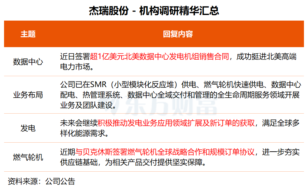 “此次合作标志着杰瑞模块化、智能化的发电解决方案成功挺进北美高端电力市场,实现了公司在北美数据中心领域的关键业务突破。”杰瑞股份在调研中表示,公司会集中力量,尽快完成设备交付。