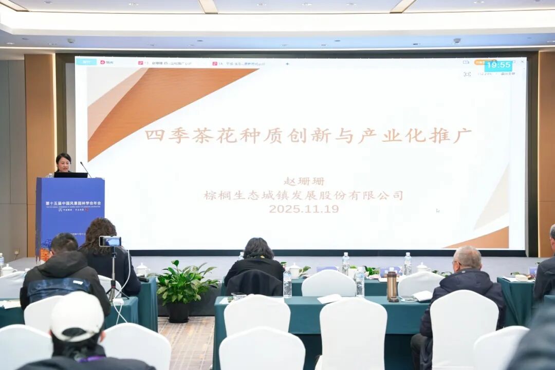 在“城市生物多样性与乡土植物应用”分论坛中,棕榈股份生态产业研究院高级工程师赵珊珊做《四季茶花种质创新及产业化推广》的主题演讲。报告详细分享了棕榈股份多年来在植物新品种研发领域的持续投入,以及由此形成的产业化成果。特别是棕榈股份以广东省特有乡土植物杜鹃红山茶为亲本,培育四季茶花新品种的自主创新之路,演讲中还分享了新品种选育、品种权授权管理、知识产权维权等全链条产业化取得的经验,为我国园林乡土植物开发应用提供了可落地、可复制的实践参考经验,受到了与会专家、学者以及同行业从业者的广泛关注。