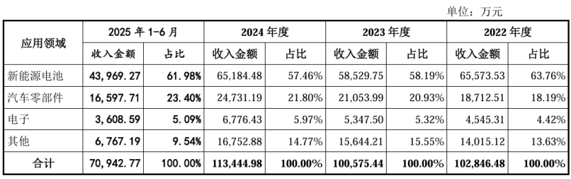 2025年1-6月,公司营业收入为71,172.90万元,同比增长35.13%。截至2025年6月末,公司在手订单含税金额为180,109.20万元,在手订单充足。公司在手订单按下游应用领域划分情况如下:
