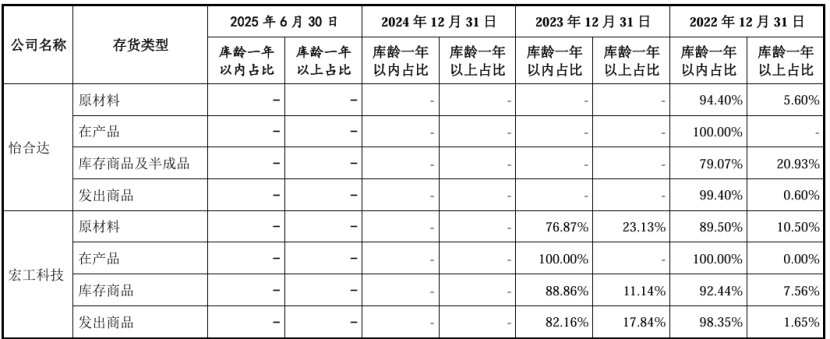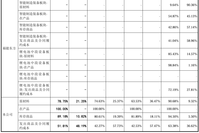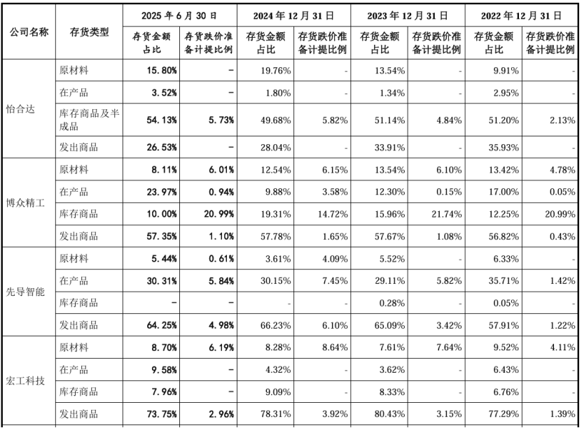 公司存货余额中发出商品及合同履约成本占比较高,与宏工科技、福能东方相近,高于怡合达、博众精工和先导智能。由于发出商品及合同履约成本均有销售订单支持且公司产品的整体毛利率空间较大,因此公司对发出商品及合同履约成本计提的存货跌价准备比例较低。公司可比公司怡合达、博众精工对库存商品计提的存货跌价准备比例较高,福能东方对库存商品、原材料、在产品计提的存货跌价准备比例较高,导致上述公司整体存货跌价准备计提比例较高。从备货政策和存货构成差异角度,公司整体存货跌价准备计提比例低于怡合达、博众精工、福能东方具有合理性。