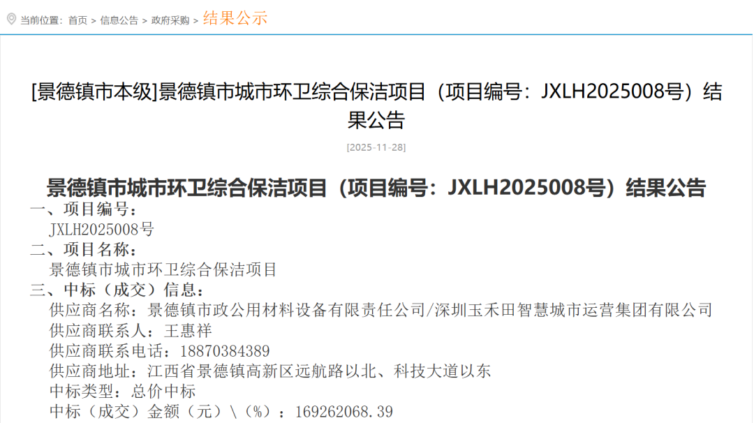 中标供应商:景德镇市政公用材料设备有限责任公司、深圳玉禾田智慧城市运营集团有限公司、北京环境股份有限公司