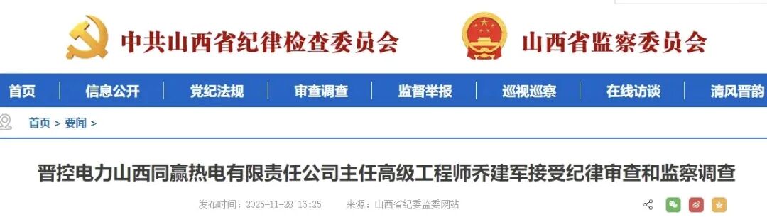 山西省纪委监委网站今日权威发布,晋控电力山西同赢热电有限责任公司主任高级工程师乔建军涉嫌严重违纪违法,目前正接受晋城市纪委监委纪律审查和监察调查。