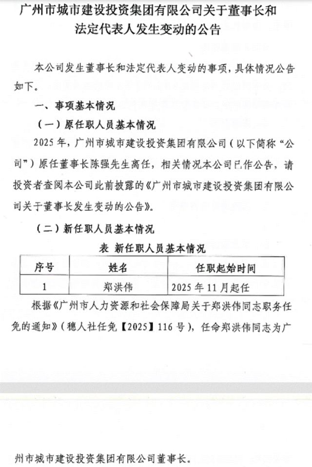 11月28日,广州市城市建设投资集团有限公司(以下简称“广州城投”)发布一纸人事变动公告,原董事长陈强离任半年后,新任一把手人选终于尘埃落定——由郑洪伟接任。