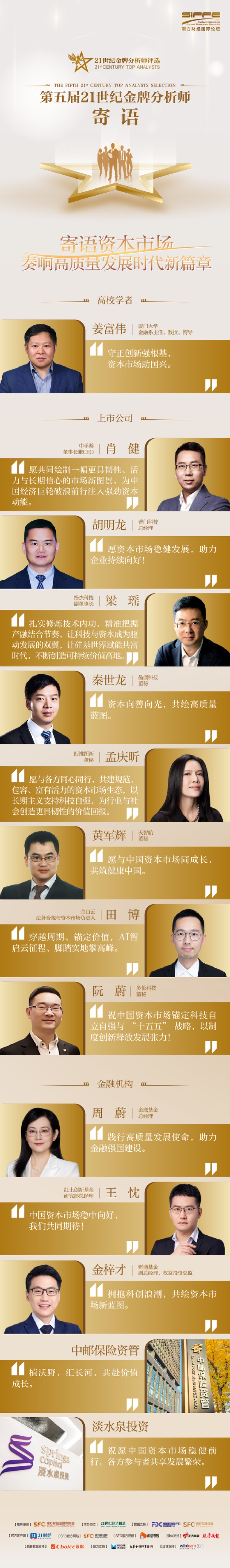 经过严谨有序的各个环节,最终的评选结果将于2025年12月6日下午,在“南方财经国际论坛·证券业年会暨2025年21世纪金牌分析师颁奖典礼”上隆重揭晓。在榜单发布前夕,我们特别汇集了来自部分评委们的真知灼见与殷切寄语,共同期待这场资本市场研究力量的集中展现。