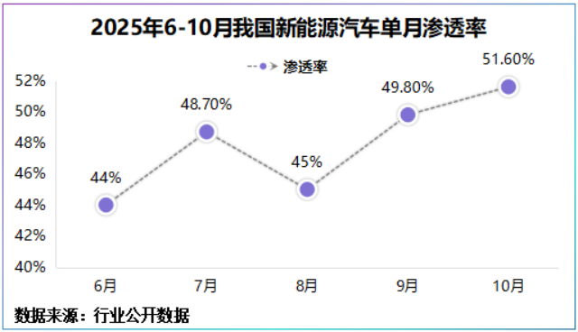 新能源汽车方面,截至2025年10月,我国新能源汽车年内累计产量为1267.2万辆,10月单月渗透率超50%。