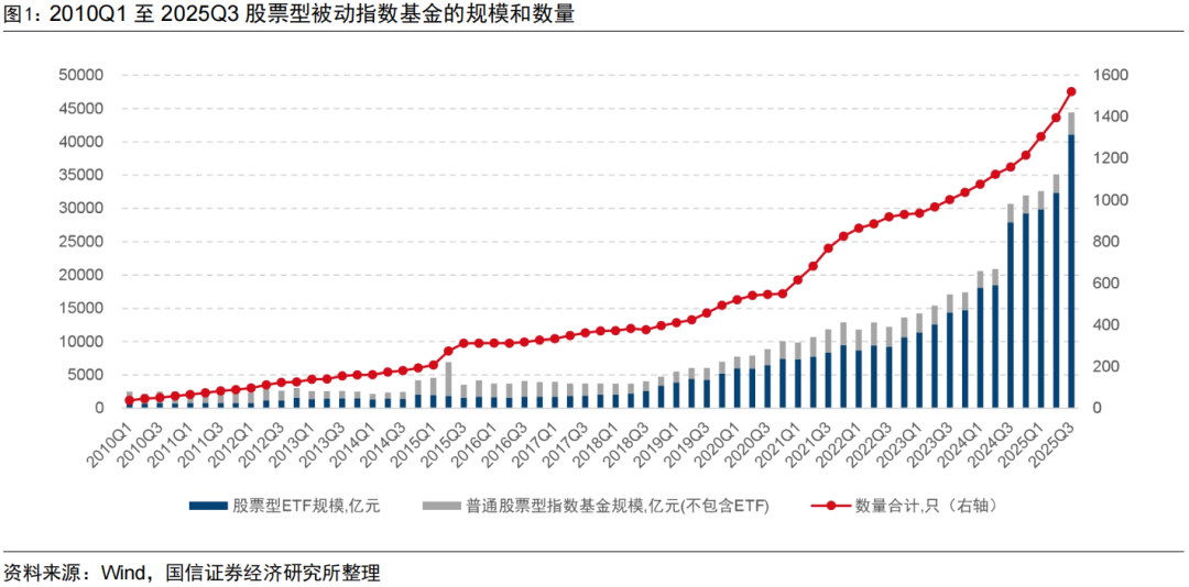 近几年,随着投资者对指数化投资接受程度的不断提高,指数基金规模不断提升。图1展示了2010Q1至2025Q3期间股票型ETF和普通股票型指数基金(不包含ETF)的规模变动情况。可以看到股票型ETF规模整体呈上升趋势,2025Q3股票型ETF规模达到4.11万亿元;普通股票型指数基金(不包含ETF)受分级基金退出等因素影响规模增速相对较低,2025年Q3略有回升。截至2025年9月30日,股票型被动指数基金共计1521只,合计规模高达4.44万亿元。