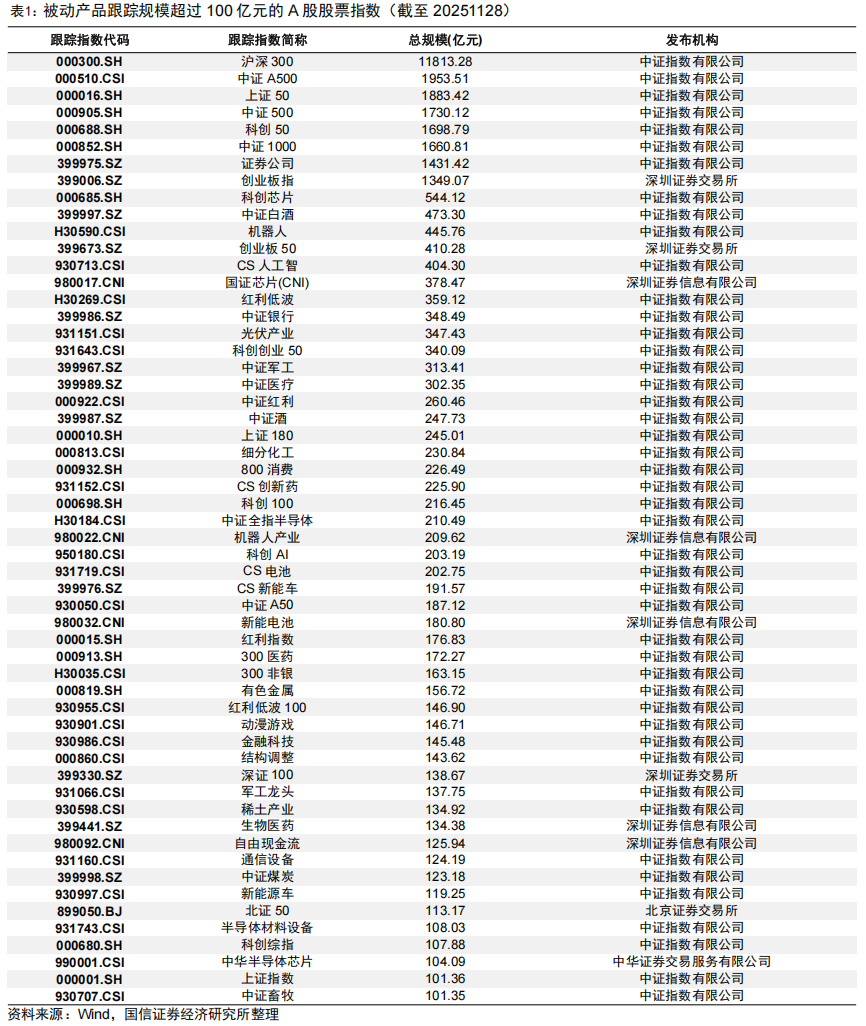 由于指数成分股调整是根据编制规则进行的被动操作,因此若成分股的调整规模较大,则可能带来交易性的投资机会。我们对跟踪不同指数的被动产品的规模进行了统计,仅考虑ETF、普通场外指数基金以及LOF,ETF联接不纳入考虑,其中,ETF规模截至2025年11月28日,场外基金以及LOF规模截至2025年9月30日。截至2025年11月28日,被动产品跟踪规模超过100亿元的A股股票指数共56只,其中跟踪规模前三的指数分别为沪深300、中证A500、上证50,跟踪规模分别为11813.28、1953.51、1883.42亿元。
