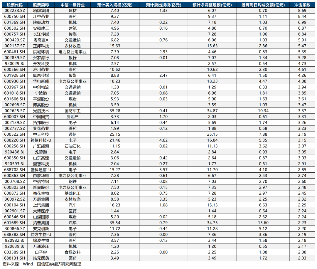 冲击系数大于2的股票如下,其中塔牌集团、江中药业、陕鼓动力等股票预计冲击较大,冲击系数分别为8.69、8.44、6.99。