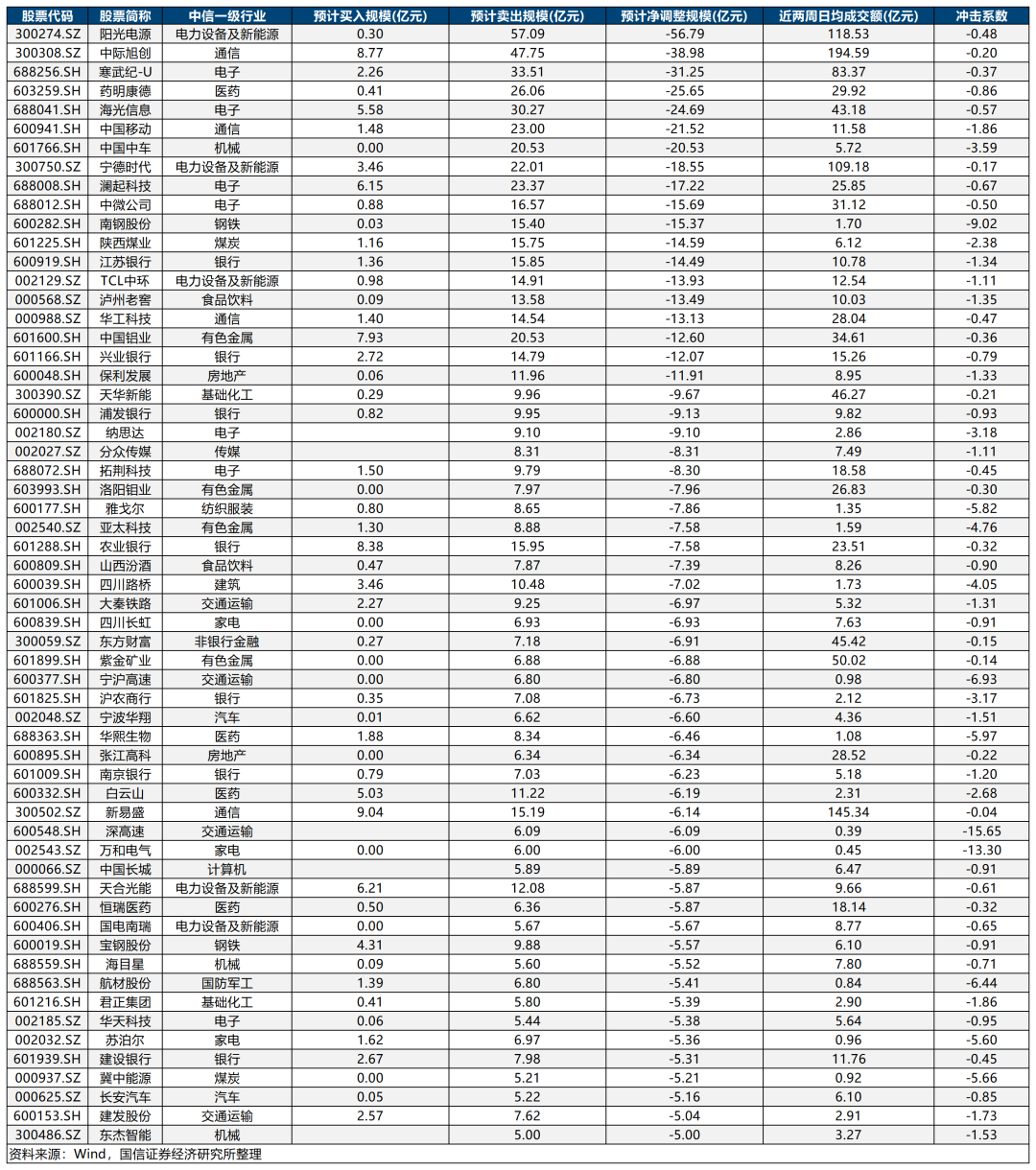 预计净卖出规模超过5亿元的股票如下,其中阳光电源、中际旭创、寒武纪等股票预计净卖出规模较大,预计净卖出规模分别达到56.79、38.98、31.25亿元。