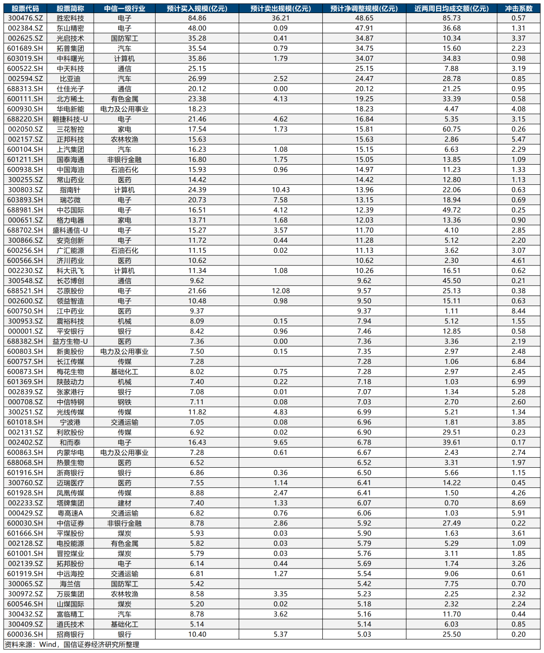 经过测算,预计净买入规模超过5亿元的股票如下,其中胜宏科技、东山精密、光启技术等股票预计净买入规模较大,预计净买入规模分别达到48.65、47.91、34.87亿元。