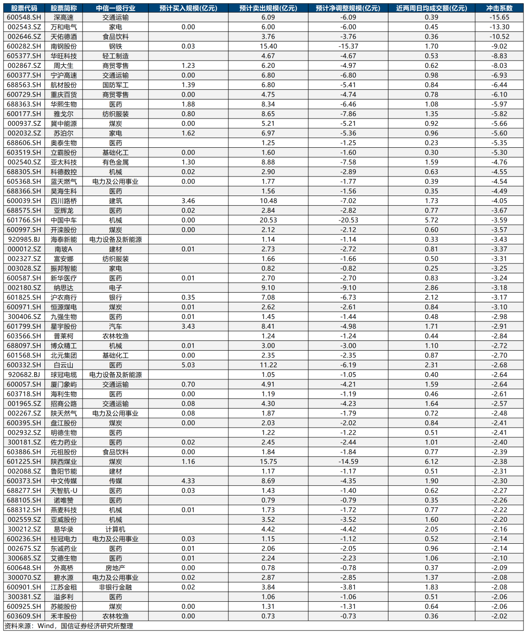 冲击系数小于-2的股票如下,其中深高速、万和电气、天佑德酒等股票预计冲击较大,冲击系数分别为-15.65、-13.30、-10.52。