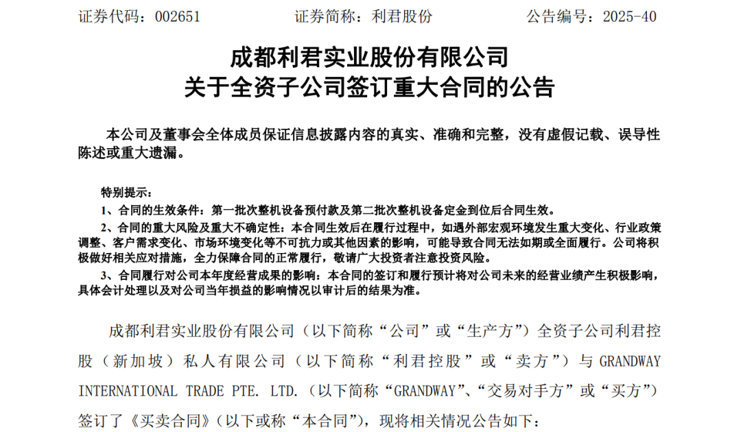 11月28日,利君股份公告称,公司全资子公司利君控股与GRANDWAY INTERNATIONAL TRADE PTE. LTD.(以下简称“GRANDWAY”)签订了《买卖合同》,卖方利君控股(含生产方)为买方GRANDWAY负责相关项目选矿厂的整体设计及技术服务,负责提供高压辊磨机及选矿厂其它所需全套设备采购技术支持,并提供相应的现场安调指导和培训指导;买方GRANDWAY向卖方利君控股采购高压辊磨机和配套设备,合同总金额5760.7728万美元,折合人民币约4.08亿元。该合同总金额占2024年度经会计师审计公司合并营业收入的52.53%,预计将对公司未来的经营业绩产生积极影响。