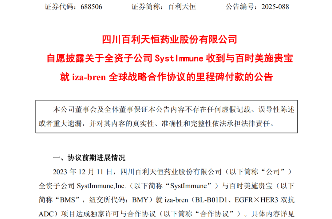 11月30日晚间,百利天恒发布公告称,公司全资子公司SystImmune,Inc.(以下简称“SystImmune”)近日收到由百时美施贵宝(以下简称“BMS”)支付的2.5亿美元里程碑付款(实际到账金额须扣除银行手续费)。