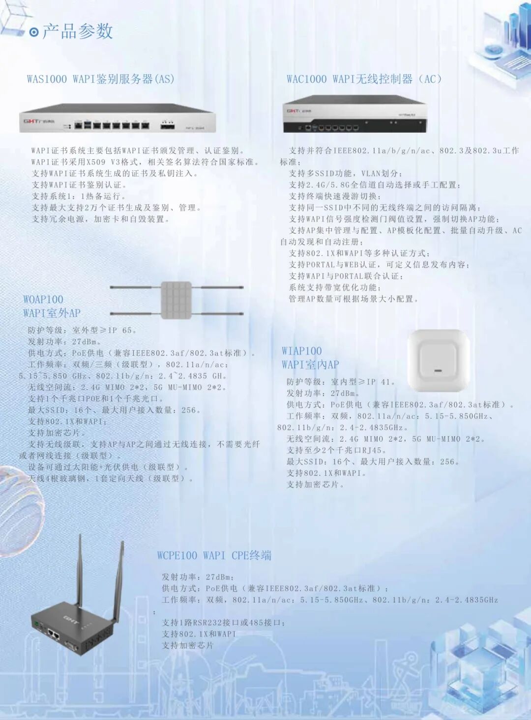 WAPI无线网络覆盖是基于国产化无线局域网鉴别和保密基础结构安全协议研发的无线覆盖解决方案。采用基于“三元对等鉴别”的访问控制架构,使用国产数字证书认证技术,实现网络设备与终端设备之间完全意义上的双向对等鉴别认证,达到合法设备接入合法网络的安全管理目的。WAPI解决方案主要由鉴别服务器(AS)、无线控制器(AC)、无线AP(室内/外)、CPE终端及相关配套设备组成。