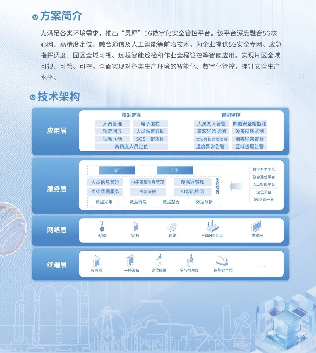 “灵犀”5G数字化安全管控平台,深度融合5G核心网、高精度定位、融合通信及人工智能等前沿技术,为企业提供5G安全专网、应急指挥调度、园区全域可视、远程智能巡检和作业全程管控等智能应用。实现片区全域可视、可管、可控,全面实现对各类生产环境的智能化、数字化管控,提升安全生产水平。
