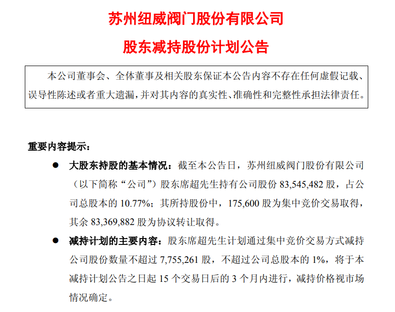 12月1日,纽威股份(603699.SH)发布公告,股东席超计划通过集中竞价交易方式减持公司股份数量不超过775.53万股,不超过公司总股本的1%,将于减持计划公告之日起15个交易日后的3个月内进行,减持价格视市场情况确定。